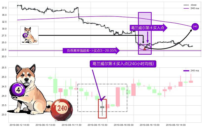 形态多维评估: ⚀ 2019-08-15 09:30:00-小时显现 葛兰威尔均线 240小时均线 第④买入点 下降趋势均值回复的短线反弹信号,后市看涨,买进信号