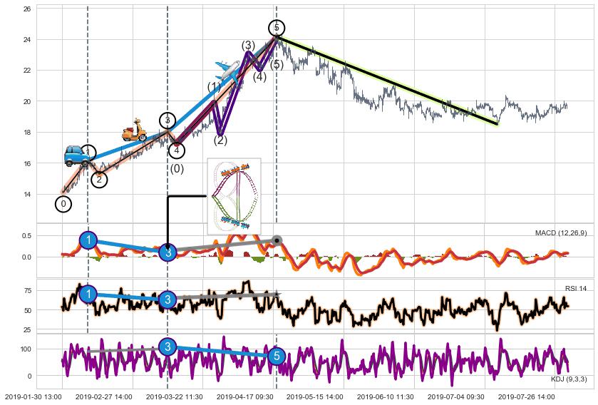 ➢ 1,3,5驱动浪MACD, RSI, KDJ走势都出现【常规背离】反转信号增强