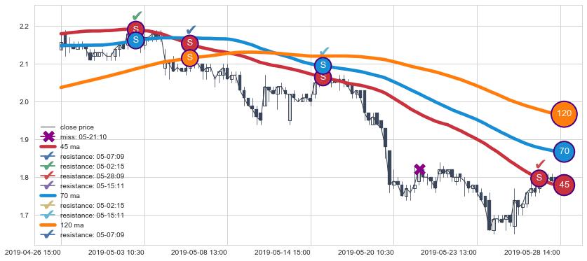 下跌趋势04-26 15:00-05-28 14:00,均线120, 45, 70确认关键阻力4处