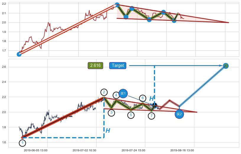 ➢ 最小中继整理涨幅→𝐇: 0.5300 (𝐇楔型旗杆的长度:楔型起点→顶点)