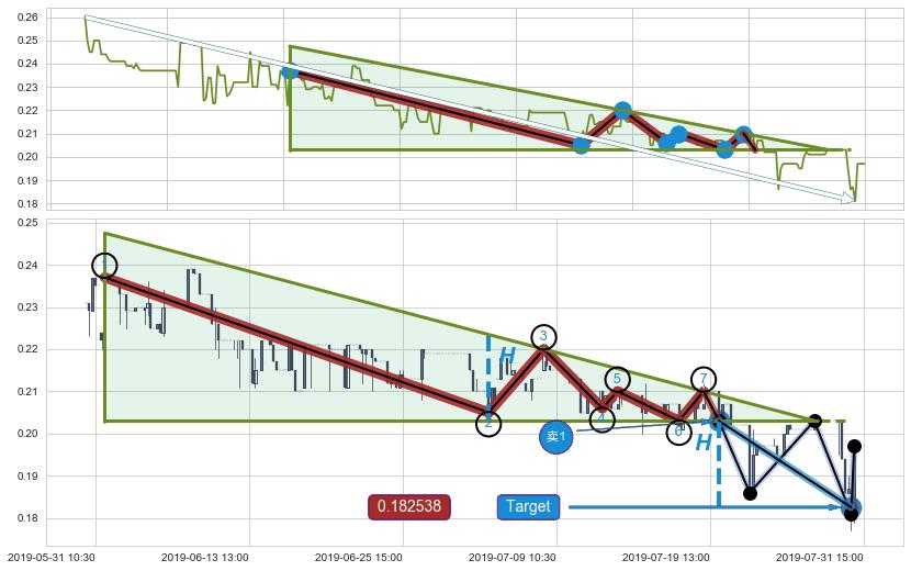 2019-06-20: 时域附近第一阻力位0.209151持续的对下跌趋势进行阻拦,有效地放缓了下跌的速度。