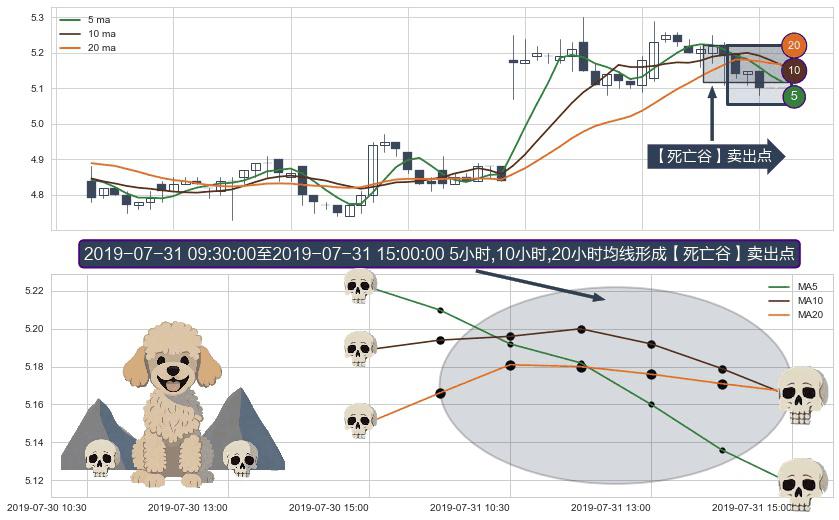 形态多维评估: ⚀ 2019-07-31 10:30:00-小时至2019-07-31 15:00:00-小时显现 5小时-10小时-20小时均线 【死亡谷】卖出点 看空信号,后市看跌,卖出
