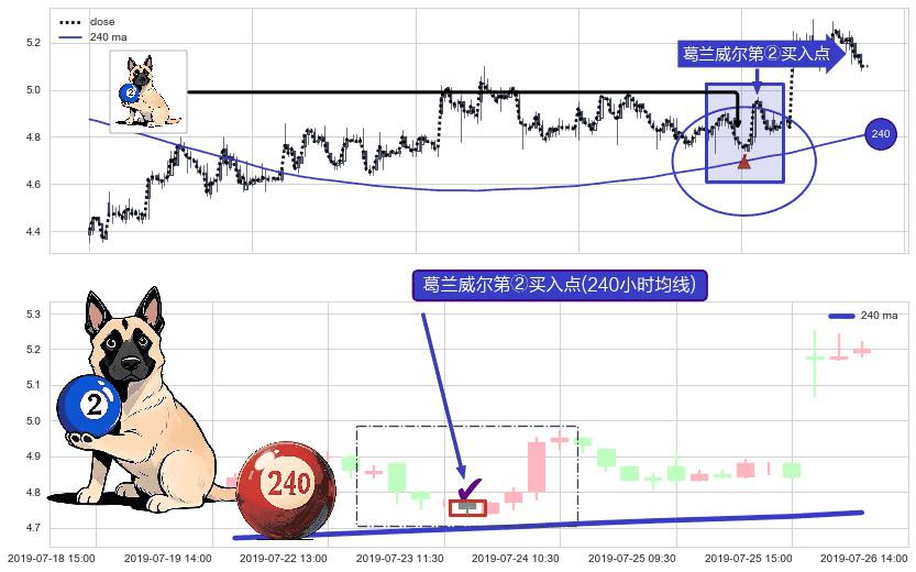 形态多维评估: ⚀ 2019-07-23 13:00:00-小时显现 葛兰威尔均线 240小时均线 第②买入点 上升趋势的中继信号,后市看涨,买进信号