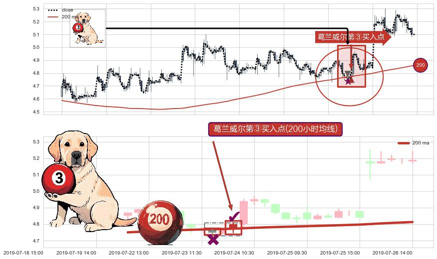 形态多维评估: ⚀ 2019-07-23 15:00:00-小时显现 葛兰威尔均线 200小时均线 第③买入点 上升趋势的中继信号,后市看涨,买进信号