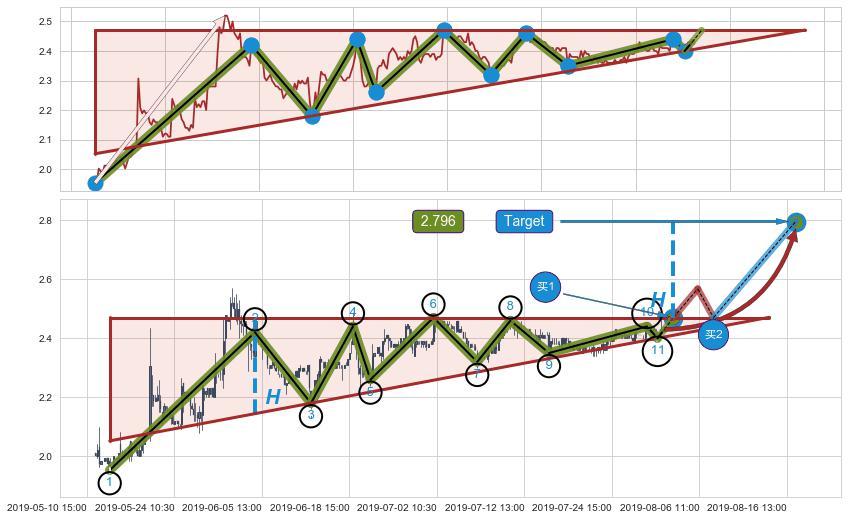 ➣ 最小中继整理涨幅→𝐇: 0.150000 (上平行阻力线与下平行支撑线的垂直距离)