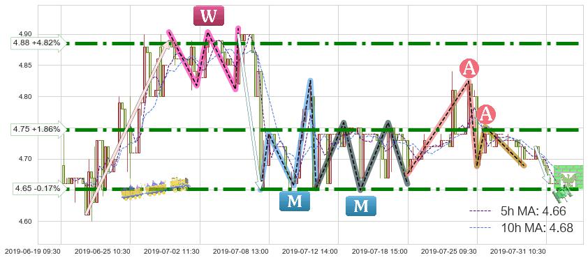 ♘ 阻力价格位4.65,可信任强度90.19%,距离最后交易2019-07-31 15:00形成的收盘价格4.66相差 -0.17%