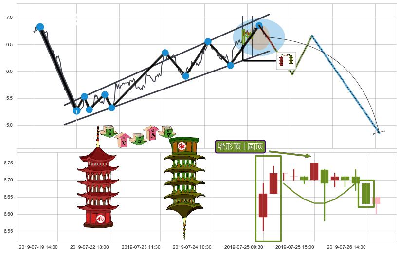 | 5 🅚:塔形顶 | 圆顶 ➕ 🌊:波浪理论猜想上涨浪5已形成,猜想后续形成回调abc下跌(均值回复) ☞ 看空信号 ⇥ 【🅚线】交织【图形】⇥ 综合量化分数: 49 | > |