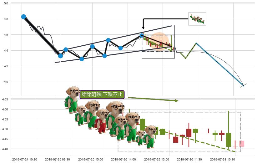 从2019-07-11 09:30至2019-07-24 10:30,共包含56个小时,阶段股价下跌-8.38%,阶段股价变动位移路程比: 1 : 4