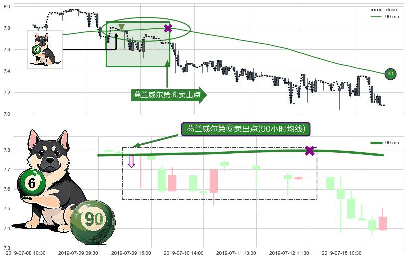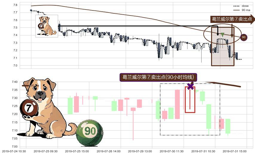 形态多维评估: ⚀ 2019-07-30 13:00:00-小时显现 葛兰威尔均线 90小时均线 第⑦卖出点 下降趋势的中继信号,后市看跌,卖出信号