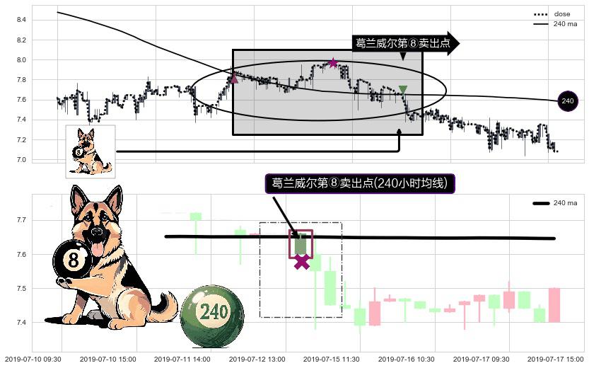 形态多维评估: ⚀ 2019-07-12 14:00:00-小时显现 葛兰威尔均线 240小时均线 第⑧卖出点 下降趋势的中继信号,后市看跌,卖出信号