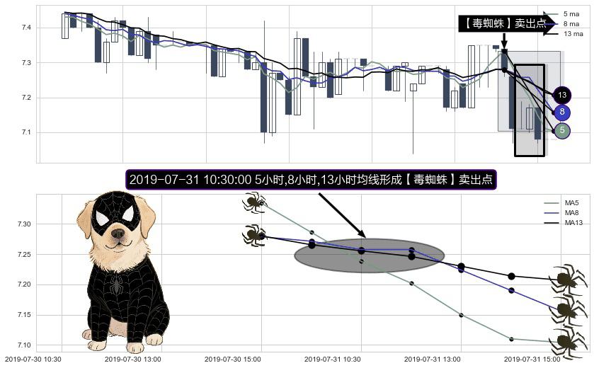 形态多维评估: ⚀ 2019-07-31 10:30:00小时显现 5小时-8小时-13小时均线 【毒蜘蛛】卖出点 看空信号,后市看跌,卖出