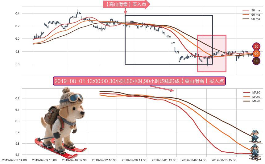 ⚀ 2019-07-17 15:00:00小时-2019-08-16 09:30:00小时显现 30小时-60小时-90小时均线 【高山滑雪】买入点 看多信号,后市看涨,买入