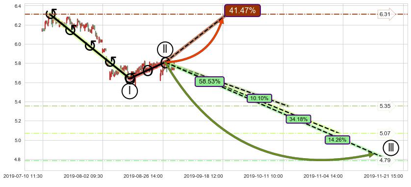➣ 调整浪已超过预测的c点位置,后续大趋势循环浪继续下跌概率58.53%,谨慎做多
