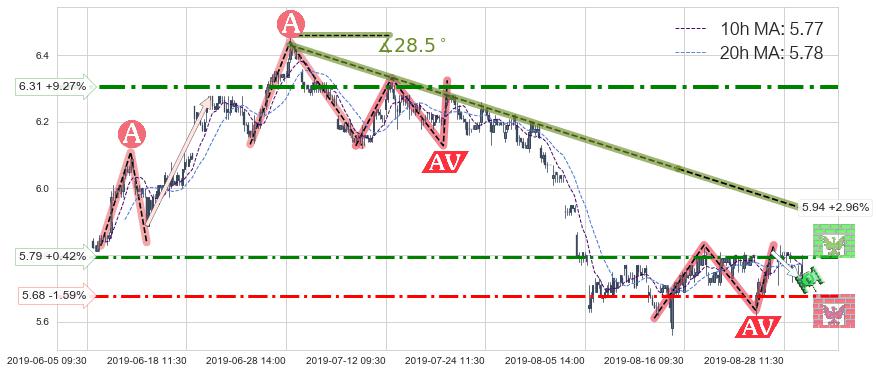 ♘ 在最后的下跌阶段2019-07-02 09:30至2019-08-15 13:00,存在 持续未破位的阻力位 ,阻力价格5.94,可信任强度74.95%,其距离最后价格5.77相差 +2.96%