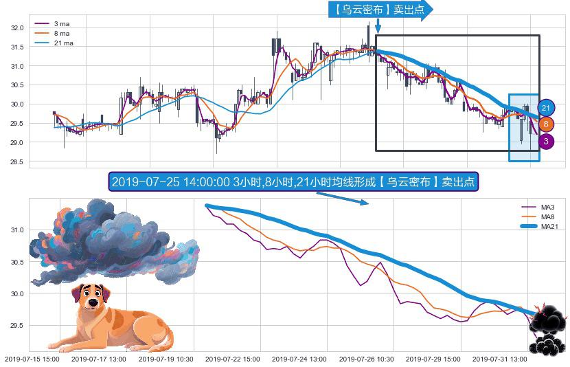 形态多维评估: ⚀ 2019-07-19 13:00:00小时-2019-07-31 15:00:00小时显现 3小时-8小时-21小时均线 【乌云密布】卖出点 看空信号,后市看跌,卖出