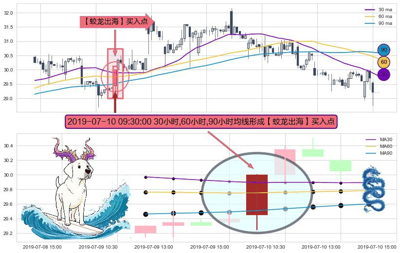 形态多维评估: ⚀ 2019-07-10 09:30:00小时显现 30小时-60小时-90小时均线 【蛟龙出海】买入点 看多信号,后市看涨,买入