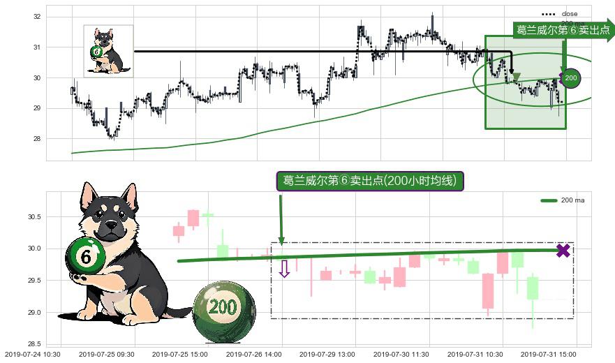 形态多维评估: ⚀ 2019-07-26 14:00:00-小时显现 葛兰威尔均线 200小时均线 第⑥卖出点 走势反转见顶信号,后市看跌,卖出信号