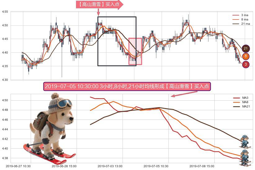 ⚀ 2019-07-02 11:30:00小时-2019-07-09 15:00:00小时显现 3小时-8小时-21小时均线 【高山滑雪】买入点 看多信号,后市看涨,买入