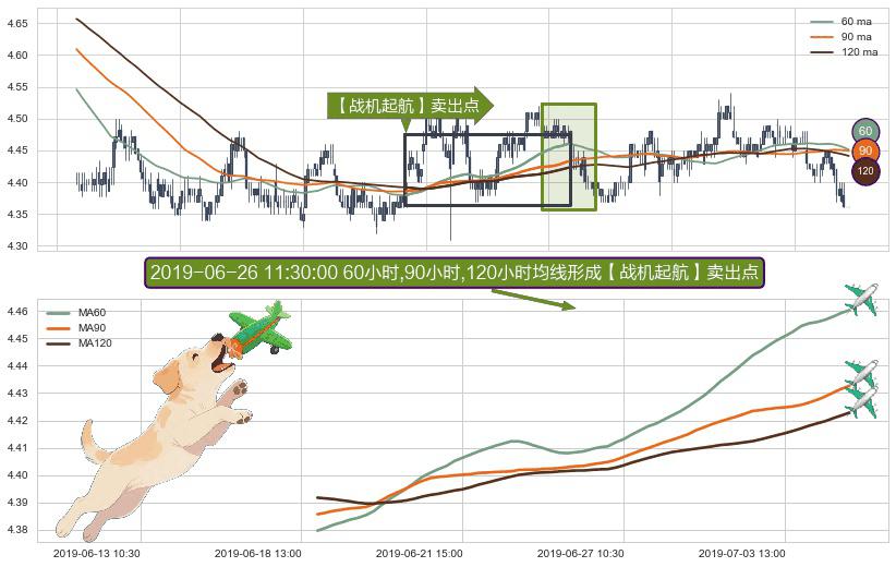 ⚀ 2019-06-18 15:00:00小时-2019-07-04 15:00:00小时显现 60小时-90小时-120小时均线 【战机起航】卖出点 看空信号,后市看跌,卖出