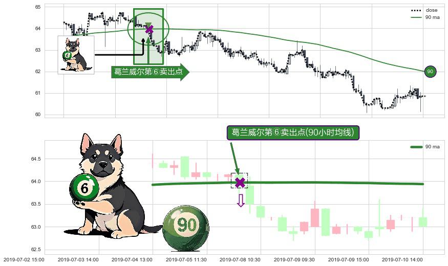 形态多维评估: ⚀ 2019-07-05 15:00:00-小时显现 葛兰威尔均线 90小时均线 第⑥卖出点 走势反转见顶信号,后市看跌,卖出信号