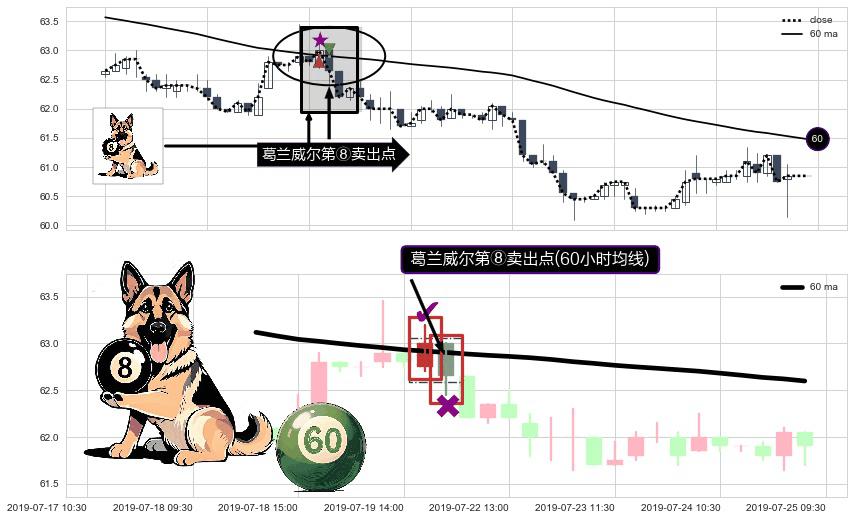 形态多维评估: ⚀ 2019-07-22 09:30:00-小时显现 葛兰威尔均线 60小时均线 第⑧卖出点 下降趋势的中继信号,后市看跌,卖出信号