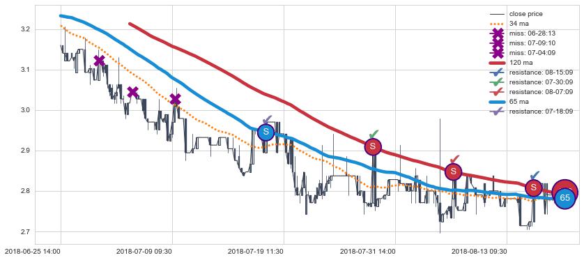 下跌趋势06-25 14:00-08-16 13:00,均线120, 65确认关键阻力4处