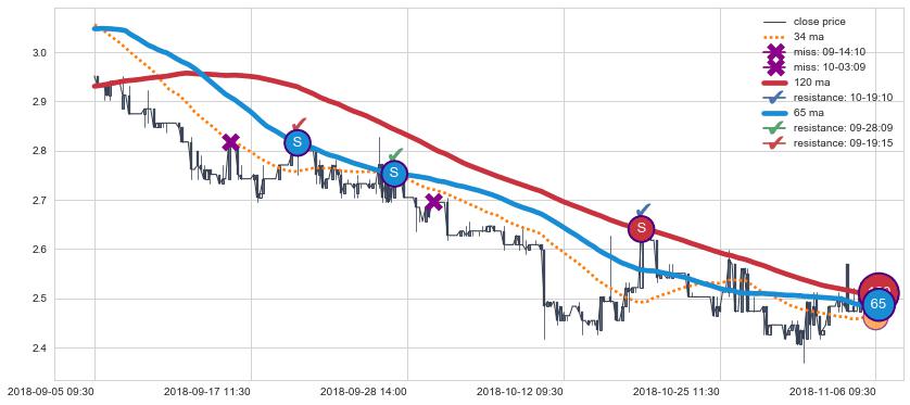 下跌趋势09-05 09:30-11-06 09:30,均线120, 65确认关键阻力3处
