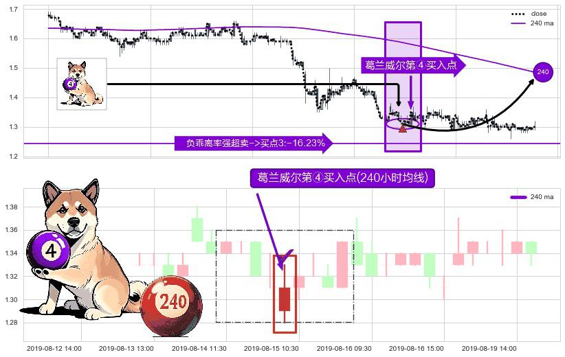 形态多维评估: ⚀ 2019-08-15 09:30:00-小时显现 葛兰威尔均线 240小时均线 第④买入点 下降趋势均值回复的短线反弹信号,后市看涨,买进信号