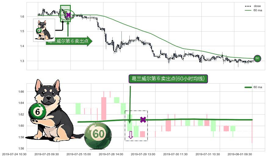 形态多维评估: ⚀ 2019-07-26 15:00:00-小时显现 葛兰威尔均线 60小时均线 第⑥卖出点 走势反转见顶信号,后市看跌,卖出信号