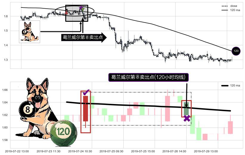 形态多维评估: ⚀ 2019-07-26 14:00:00-小时显现 葛兰威尔均线 120小时均线 第⑧卖出点 下降趋势的中继信号,后市看跌,卖出信号