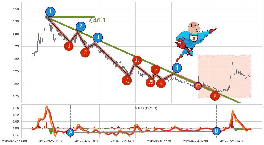 从2019-03-12 13:00至2019-07-19 09:30,共包含514个小时,阶段股价下跌-44.87%,阶段股价变动位移路程比: 1 : 15,下跌趋势角度: 46.1
