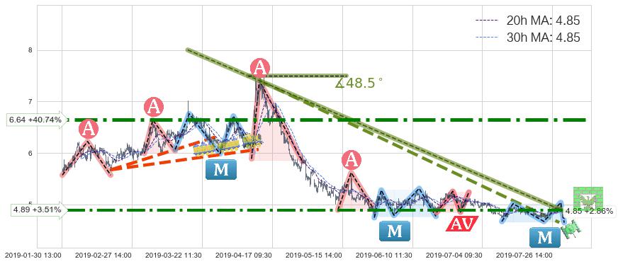 从2019-04-12 09:30至2019-07-30 11:30,共包含429个小时,阶段股价下跌-38.52%,阶段股价变动位移路程比: 1 : 7,下跌趋势角度: 45.4