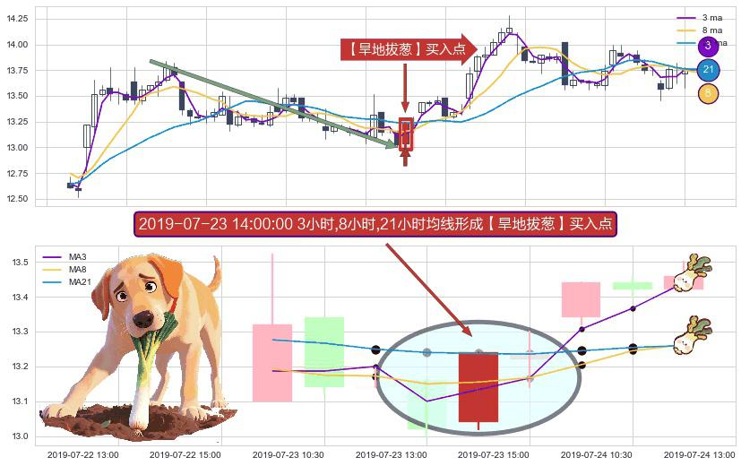 形态多维评估: ⚀ 2019-07-23 14:00:00小时显现 60小时-90小时-120小时均线 【鱼跃龙门】买入点 看多信号,后市看涨,买入