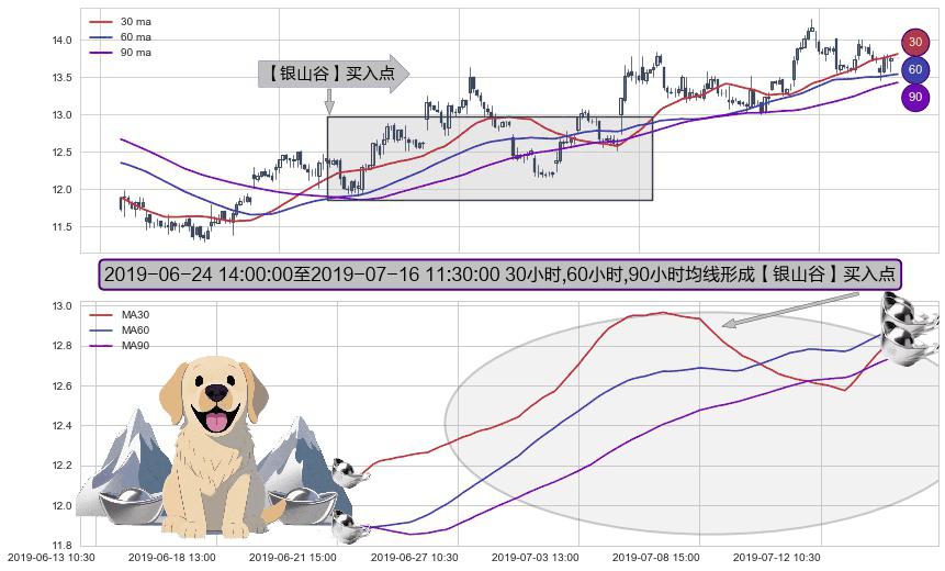 形态多维评估: ⚀ 2019-06-24 15:00:00-小时至2019-07-16 11:30:00-小时显现 30小时-60小时-90小时均线 【银山谷】买入点 看多信号,后市看涨,买入
