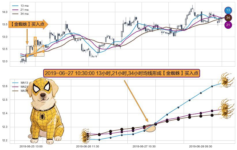 形态多维评估: ⚀ 2019-06-27 10:30:00小时显现 13小时-21小时-34小时均线 【金蜘蛛】买入点 看多信号,后市看涨,买入