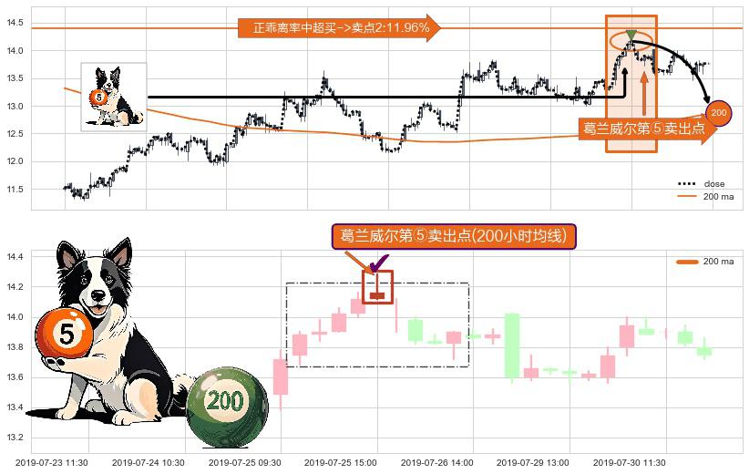 形态多维评估: ⚀ 2019-07-25 15:00:00-小时显现 葛兰威尔均线 200小时均线 第⑤卖出点 上升趋势均值回复的短线回落信号,后市看跌,卖出信号
