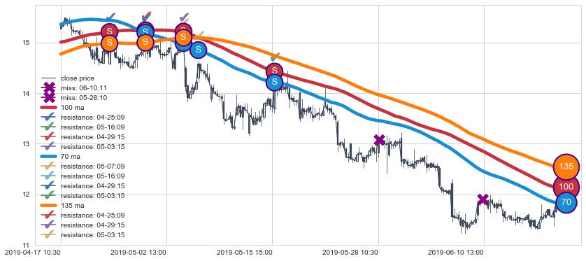 下跌趋势04-17 10:30-06-18 10:30,均线100, 70, 135确认关键阻力5处