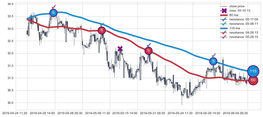 下跌趋势04-24 11:30-06-04 10:30,均线115, 60确认关键阻力4处