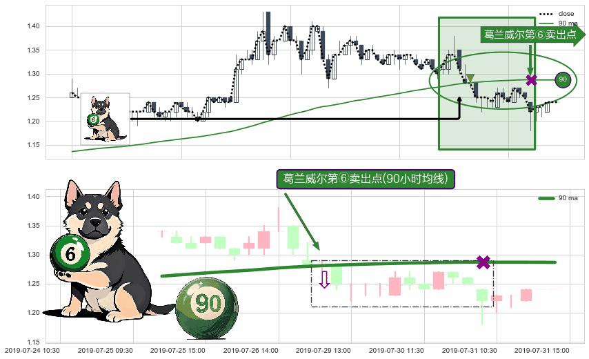 ⚀ 2019-07-29 10:30:00-小时显现 葛兰威尔均线 90小时均线 第⑥卖出点 走势反转见顶信号,后市看跌,卖出信号