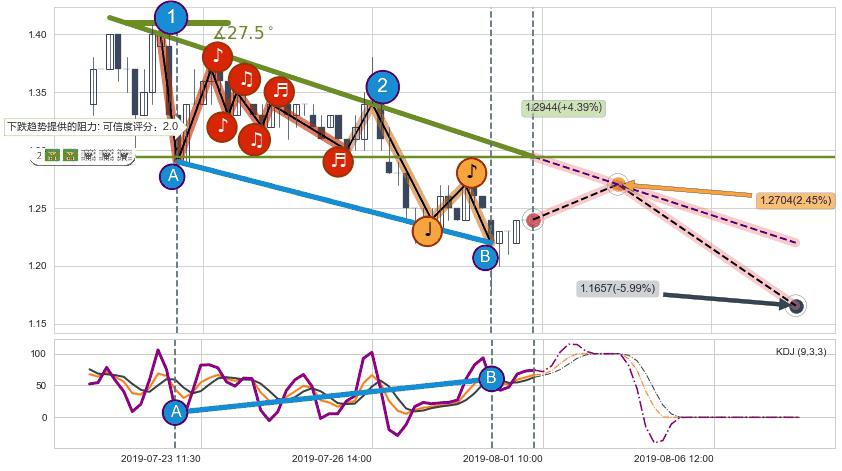 ➢ 预测:2019-08-02 13:00,【小幅反弹】稳定目前下跌趋势的前提下,预测价格:1.2704