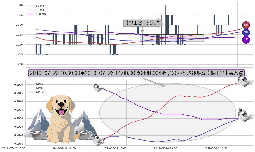 形态多维评估: ⚀ 2019-07-22 11:30:00-小时至2019-07-26 14:00:00-小时显现 60小时-90小时-120小时均线 【银山谷】买入点 看多信号,后市看涨,买入