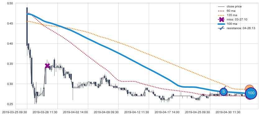 下跌趋势05-14 15:00-06-25 10:30,均线100, 60, 135确认关键阻力4处