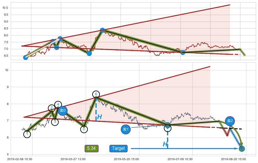 ➣ 【支撑】低点支撑位【③⑤⑦】一底低于一底,构成扩散三角的下斜边