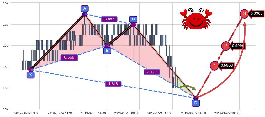➣ 未完成【螃蟹】形态起点X: 06-06:15, 已到达C点: 07-16:13, 预测最终D点: 08-07:11, 共244交易小时