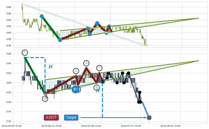 ➢ 最小中继整理跌幅→𝐇: 0.0750000 (𝐇楔型旗杆的长度:楔型起点→顶点)