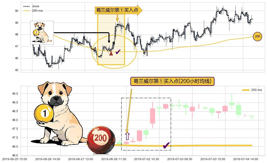 ⚀ 2019-06-28 11:30:00-小时显现 葛兰威尔均线 200小时均线 第买①入点 走势反转见底信号,后市看涨,买进信号
