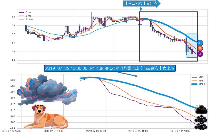 形态多维评估: ⚀ 2019-07-25 10:30:00小时-2019-07-31 15:00:00小时显现 3小时-8小时-21小时均线 【乌云密布】卖出点 看空信号,后市看跌,卖出