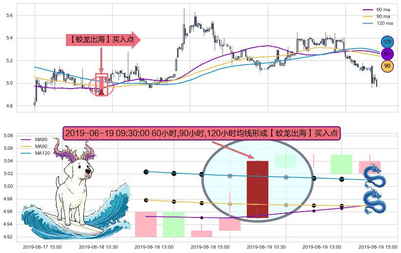 形态多维评估: ⚀ 2019-06-19 09:30:00小时显现 60小时-90小时-120小时均线 【蛟龙出海】买入点 看多信号,后市看涨,买入