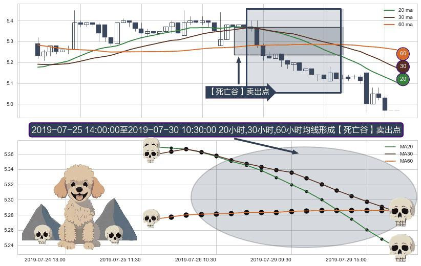 形态多维评估: ⚀ 2019-07-25 15:00:00-小时至2019-07-30 10:30:00-小时显现 20小时-30小时-60小时均线 【死亡谷】卖出点 看空信号,后市看跌,卖出