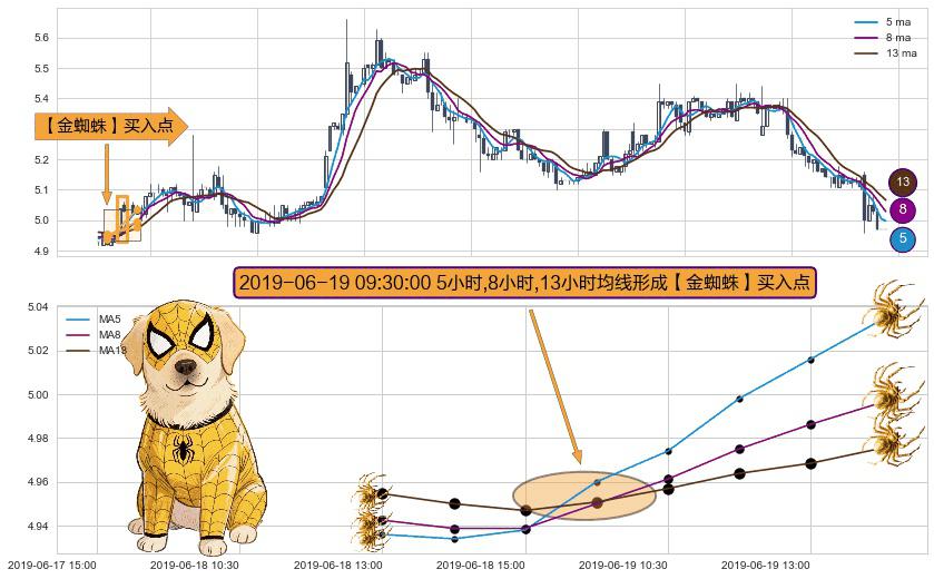 形态多维评估: ⚀ 2019-06-19 09:30:00小时显现 5小时-8小时-13小时均线 【金蜘蛛】买入点 看多信号,后市看涨,买入